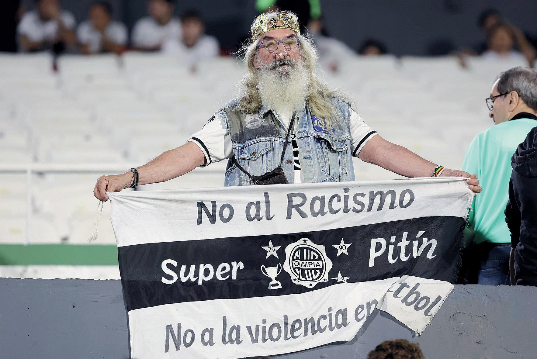 Súper Pitín, don Pedro Santiago Godoy, también se une a la condena unánime del fútbol contra el racismo. El legendario hincha del Olimpia se manifestó con una pancarta durante el partido de su club frente a Nacional.