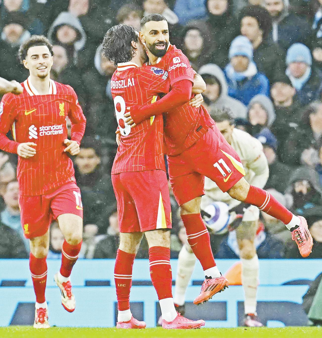 Mohamed Salah (derecha) festeja su conquista con sus compañeros en la victoria del Liverpool sobre el City