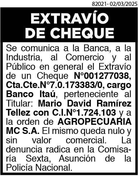 EDICTO. LA JUEZ DEL JUZGADO DE PRIMERA INSTANCIA EN LO CIVIL Y COMERCIAL DEL PRIMER TURNO DE LA CIRCUNSCRIPCIÓN JUDICIAL DE LA CIUDAD DE SAN JUAN BAUTISTA MISIONES, ABG. NANCY LILIAN LARRE VILLALBA, ha dictado la S.D. N° 20 de fecha 24 de Febrero de 2025, en el Expediente caratulado: “NARDI ALEJANDRO GUERRERO DURAND Y CINTIA ROSANA SEIDEL S/ PRIVACIÓN DE EFICACIA JURÍDICA”, N° 266 – Año 2024, tramitado ante la Secretaria N° 02, de este Juzgado, disponiendo la publicación por el plazo de 5 (cinco) días, y que transcripta en su parte resolutiva dice: “…1.- PRIVAR DE EFICACIA JURIDICA, a los TITULOS DE CREDITO (Cheques) N° 491103, 491108, 491115, 491116 de la serie 42,109356, 109357, 109360, 109373, 109389, 109394, 109395, 109396, 109397, 109398, 109399, 109400 de la serie 53, cheques N° 116177, 116184, 116185, 116186, 116209, 116212, 116218, 116225 de la serie 69, cheques N° 180828,