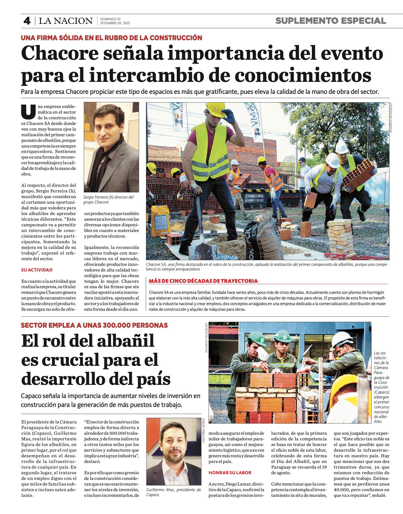 Bajo la iniciativa del especialista en empleo, Enrique López Arce, se viene realizando el primer Campeonato Nacional de Albañiles durante cuatro sábados consecutivos. El certamen que arrancó el 26 de agosto prosiguió el pasado 2 de setiembre, y ayer se celebró la tercera jornada. La gran final tendrá lugar el próximo sábado 16 de setiembre ocasión en que se conocerá al equipo ganador. El evento se desarrolla con gran éxito en las instalaciones de la Cámara Paraguaya de la Construcción (Capaco) que es uno de los organizadores junto con la Cámara Vial Paraguaya (Cavialpa) y la Cámara Paraguaya de Desarrolladores Inmobiliarios (Capadei). A ellos se suman importantes empresas del rubro de la construcción que apoyan el evento con sus productos.