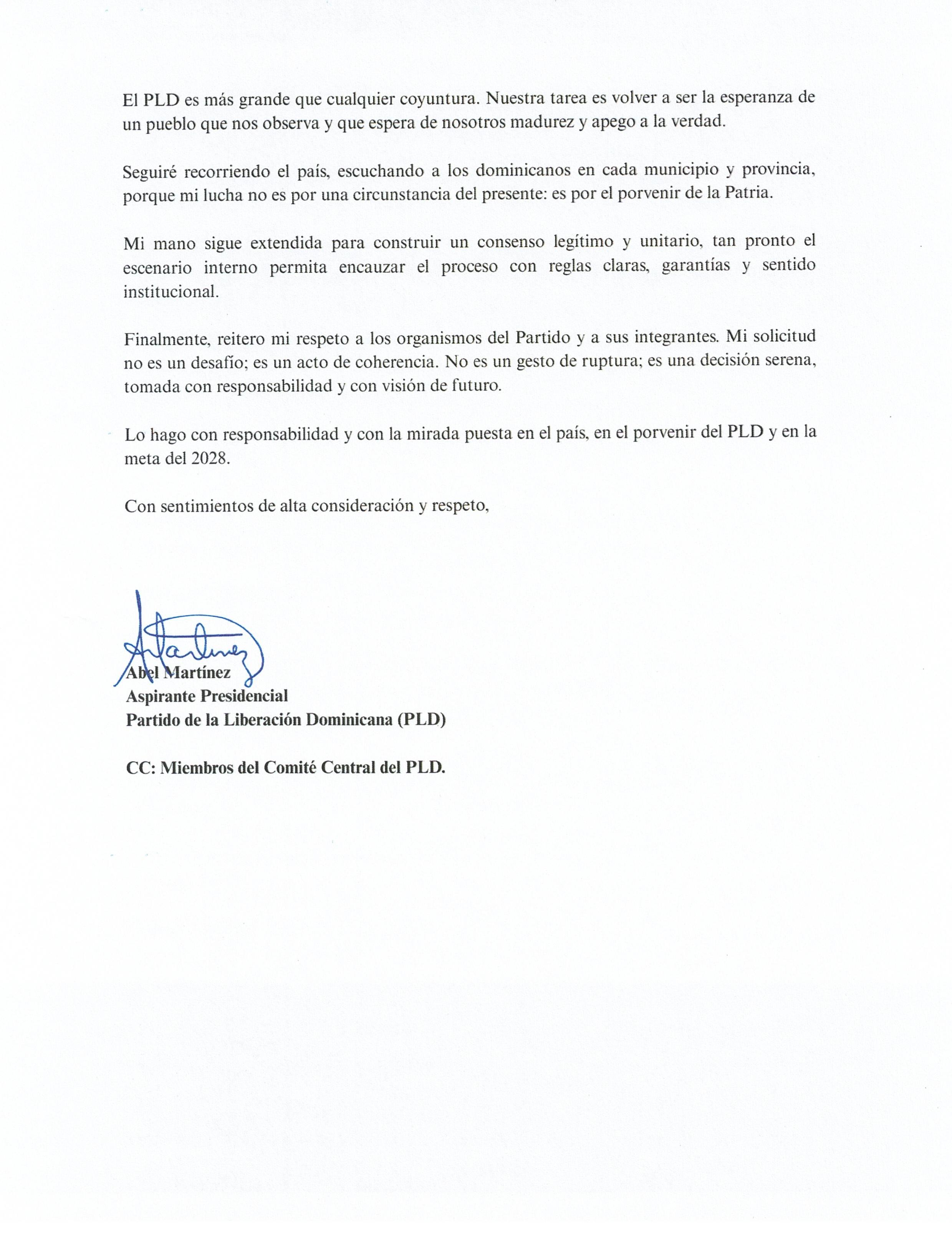 Abel Martinez carta al PLD