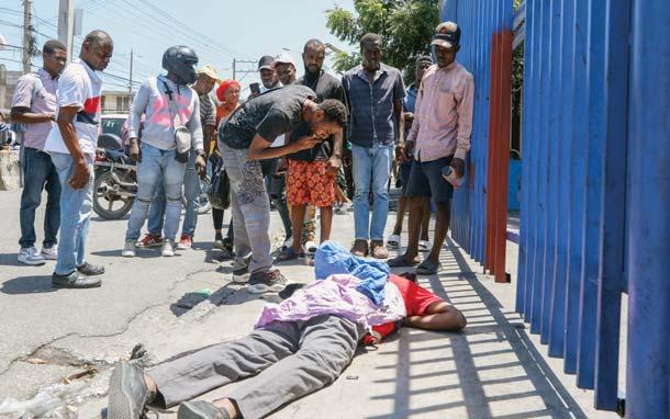 p PUERTO PRÍNCIPE. Un hombre yace tendido en el suelo, a las afueras del Palacio Nacional de Haití, cuyas actividades se vieron afectadas por intensos tiroteos entre policías de dicho país y las pandillas, lideradas por Jimmy Cherizier, alias Barbeque, de acuerdo a la agencia EFE. La prensa internacional reportó al menos cinco uniformados heridos, incluyendo uno de gravedad, aunque no se informó de bajas civiles. b P5