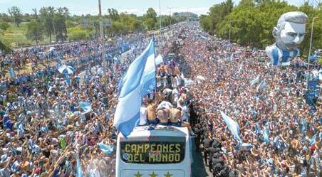 p BUENOS AIRES. Millones de argentinos se lanzaron a las calles ayer para dar la bienvenida a los campeones del mundo del fútbol. Con Leonel Messi a la cabeza, los integrantes del seleccionado argentino disfrutaron de una enorme fiesta nacional, la cual no se ha detenido desde que derrotaron a Francia el domingo pasado en la final de la Copa del Mundo de Qatar. La fiesta se puso tan intensa que los jugadores fueron sacados del bus y transportados en helicóptero al centro de la ciudad. P13-14