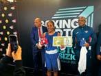 0 La boxeadora María Moronta, al centro, sonríe luego de ganar su boleto a París 2024. A la derecha su entrenador, Armando Hernández.