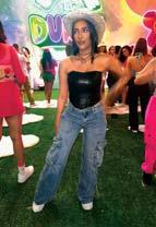 transparente de mucho brillo, cristales y pedrería, que dejaba ver sus atributos. El estilo lo complementó con su cabellera rosada (cambia de color constantemente), unas gafas grandes Dior y botas de piel de peluche blancas. Haciendo ho-
