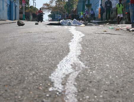 pPUERTO PRÍNCIPE. La violencia de las pandillas criminales de Haití sigue dejando víctimas y ayer se reportaron siete nuevas víctimas en la capital haitiana, como muestra esta foto de Prensa Asociada con la estela de sangre en una calle desolada. Los haitianos siguen tratando de conformar un consejo presidencial provisional para asumir el mando del gobierno, mientras siguen las dudas de quién liderará la misión de estabilización del país. b P4