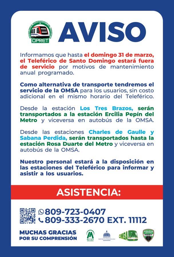 SANTO DOMINGO. La Oficina para el Reordenamiento del Transporte (Opret) informó que suspenderá los servicios de la Línea I del Teleférico de Santo Domingo en el tramo I y II desde el pasado sábado 23 de marzo hasta el domingo 31, debido a una jornada de mantenimiento anual programado.