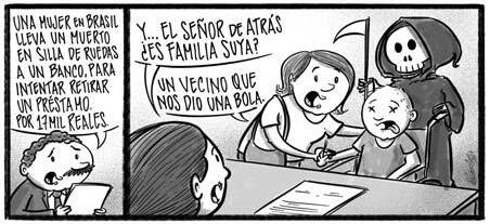 BRASIL Una mujer llevó un cadáver en una silla de ruedas a un banco de Río de Janeiro, para intentar retirar un préstamo en nombre del difunto. Erika de Souza Vieira Nunes, cuyo insólito intento de fraude fue grabado en vídeo por un empleado del banco, se ha hecho viral en las redes sociales. La mujer fue acusada formalmente de vilipendio de cadáver y quedó detenida in fraganti. EFE
