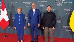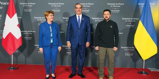 STANSSTAD. La presidenta federal de Suiza, Viola Amherd, posa junto al presidente dominicano Luis Abinader y el de Ucrania, Volodymyr Zelensky, durante la Reunión por la Paz en Ucrania, en Stansstad, cerca de Lucerna, Suiza. La reunión se celebró este sábado 15 y domingo 16 de junio y contó con la participación de 60 mandatarios de diferentes partes del mundo. Abinader fue el único presidente del Caribe en estar presente. P4