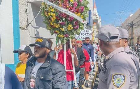 SANTIAGO. Ciudadanos de la llamada Ciudad Corazón se lanzaron ayer a las calles a protestar pacíficamente en contra de la reforma fiscal presentada el pasado lunes por el Gobierno, pero también contra la Empresa Distribuidora del Norte (Edenorte) por los constantes apagones que afectan la zona. En la foto se ve cómo llevan una corona fúnebre con la frase “Edenorte nos estás matando en vida”.