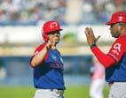 0 Gustavo Núñez, izquierda, celebra junto al coach Héctor de la Cruz durante el partido que el Escogido derrotó al Japan Breeze.