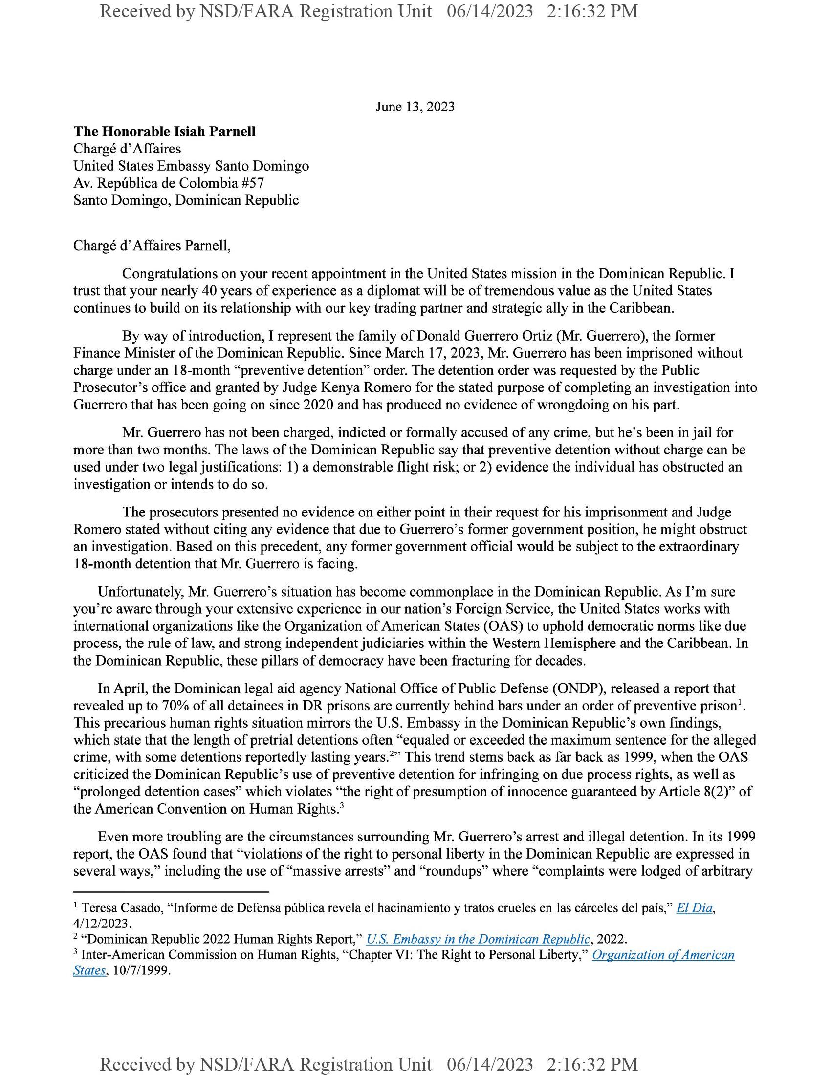 Carta enviada a la Embajada de EE.UU. en RD