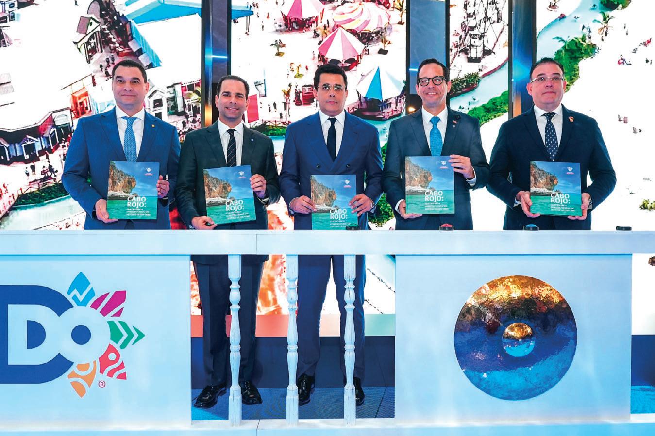 p MADRID. El Fideicomiso Pro-Pedernales anunció ayer, en el marco de la Feria Internacional de Turismo (Fitur), la entrada en operación de su socio estratégico, el Consorcio Cabo Rojo (liderado por el Grupo Puntacana, AFI Reservas y AFI Popular), que asumirá la dirección y gestión del proyecto de desarrollo turístico Cabo Rojo–Pedernales. En la foto: José Manuel Cuervo, de AFI Popular; Frank Elías Rainieri, CEO de Grupo Puntacana; el ministro de Turismo, David Collado; Sigmund Freund, director honorífico del Fideicomiso Pro Pedernales e Ian Rondón, de AFI Reservas durante la presentación. b P14