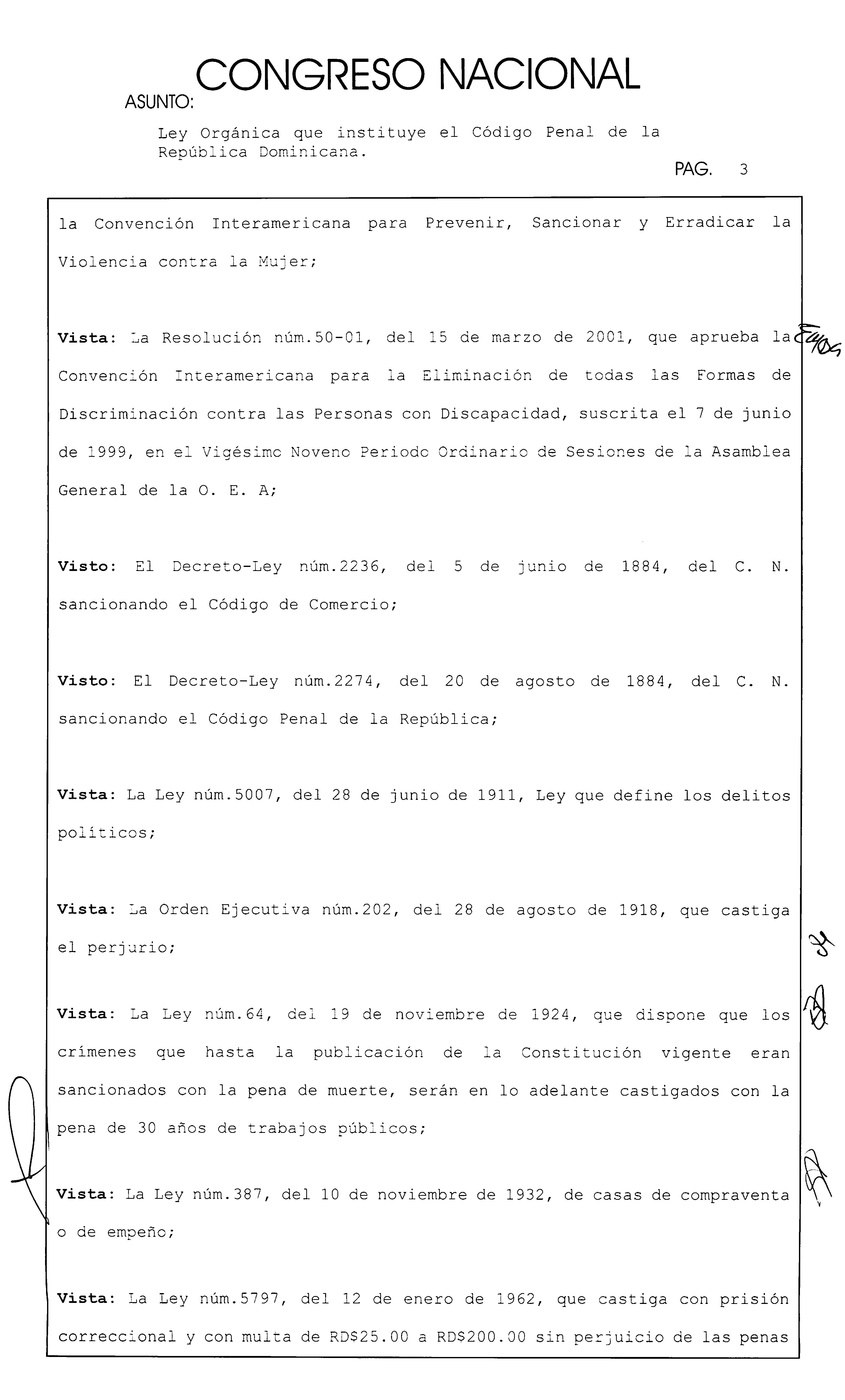 Considerando primero: Que el Código Penal de la República Dominicana, promulgado mediante el Decreto-Ley núm.2274, del 20 de agosto de 1884, después de más de un siglo de vigencia, es un instrumento legal que no responde eficazmente a las necesidades de prevención, control y represión de las infracciones que se presentan actualmente en la sociedad dominicana y a nivel internacional;