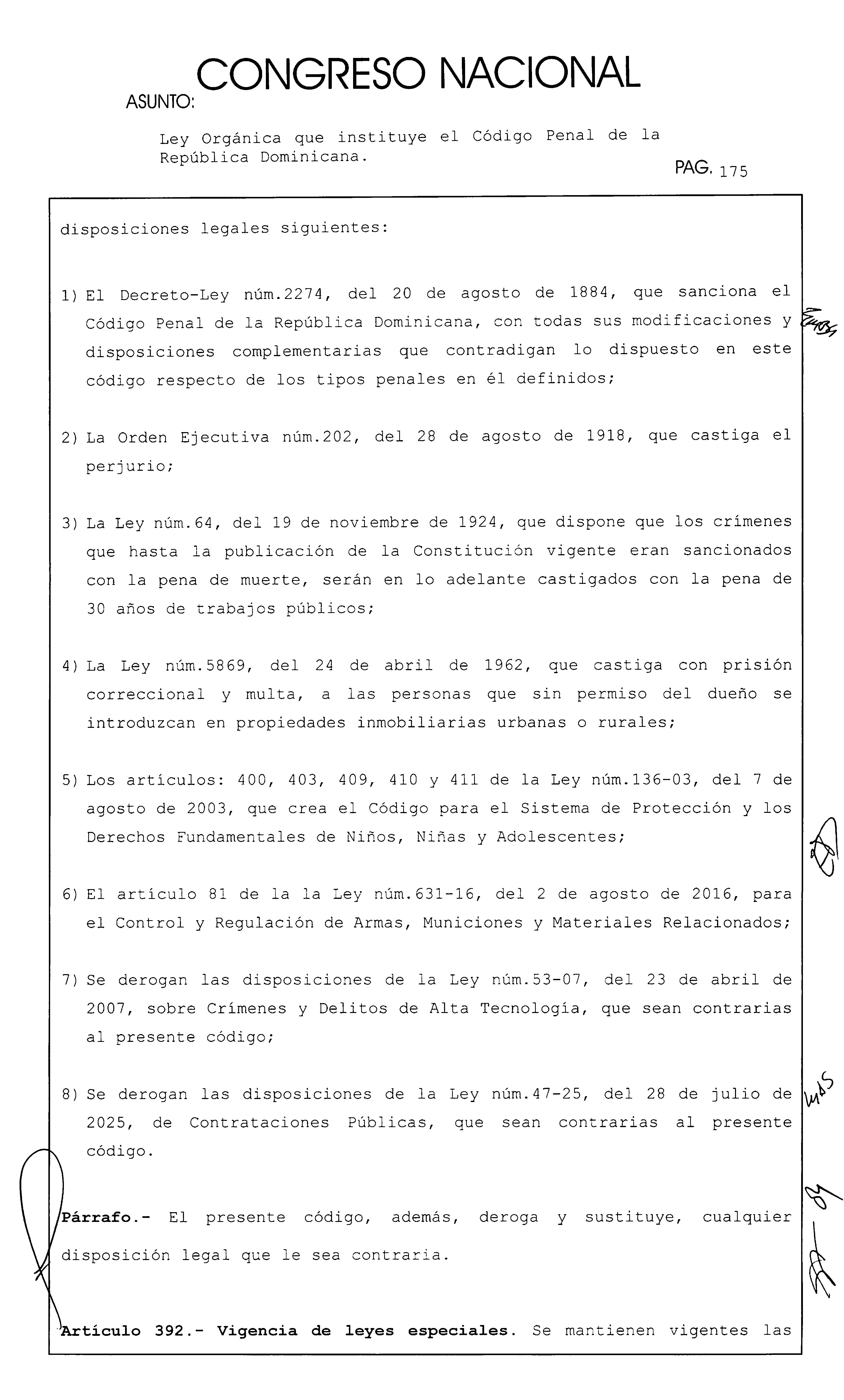 1) El Decreto-Ley núm.2274, del 20 de agosto de 1884, que sanciona el Código Penal de la República Dominicana, con todas sus modificaciones y disposiciones complementarias que contradigan lo dispuesto en este código respecto de los tipos penales en él definidos;