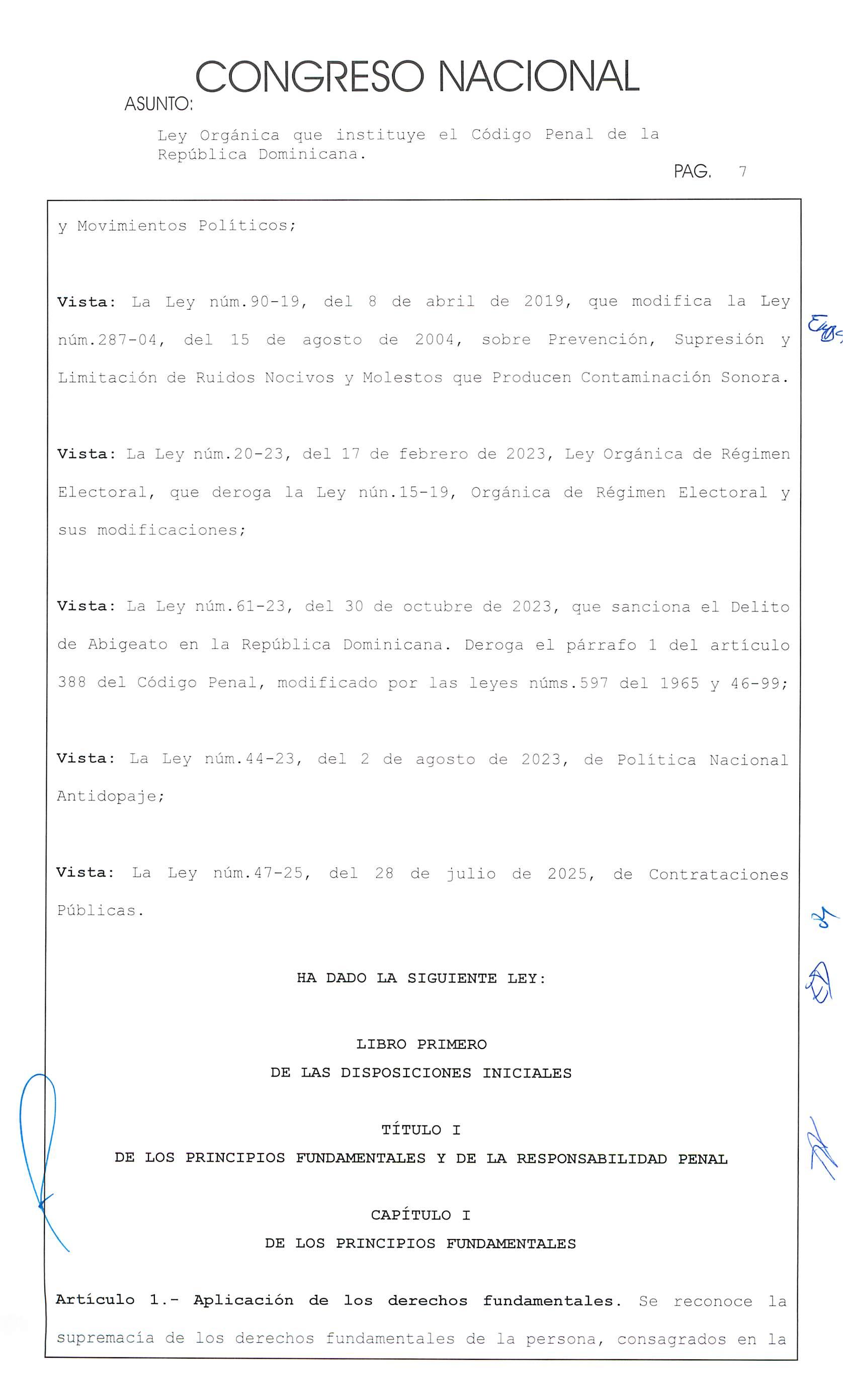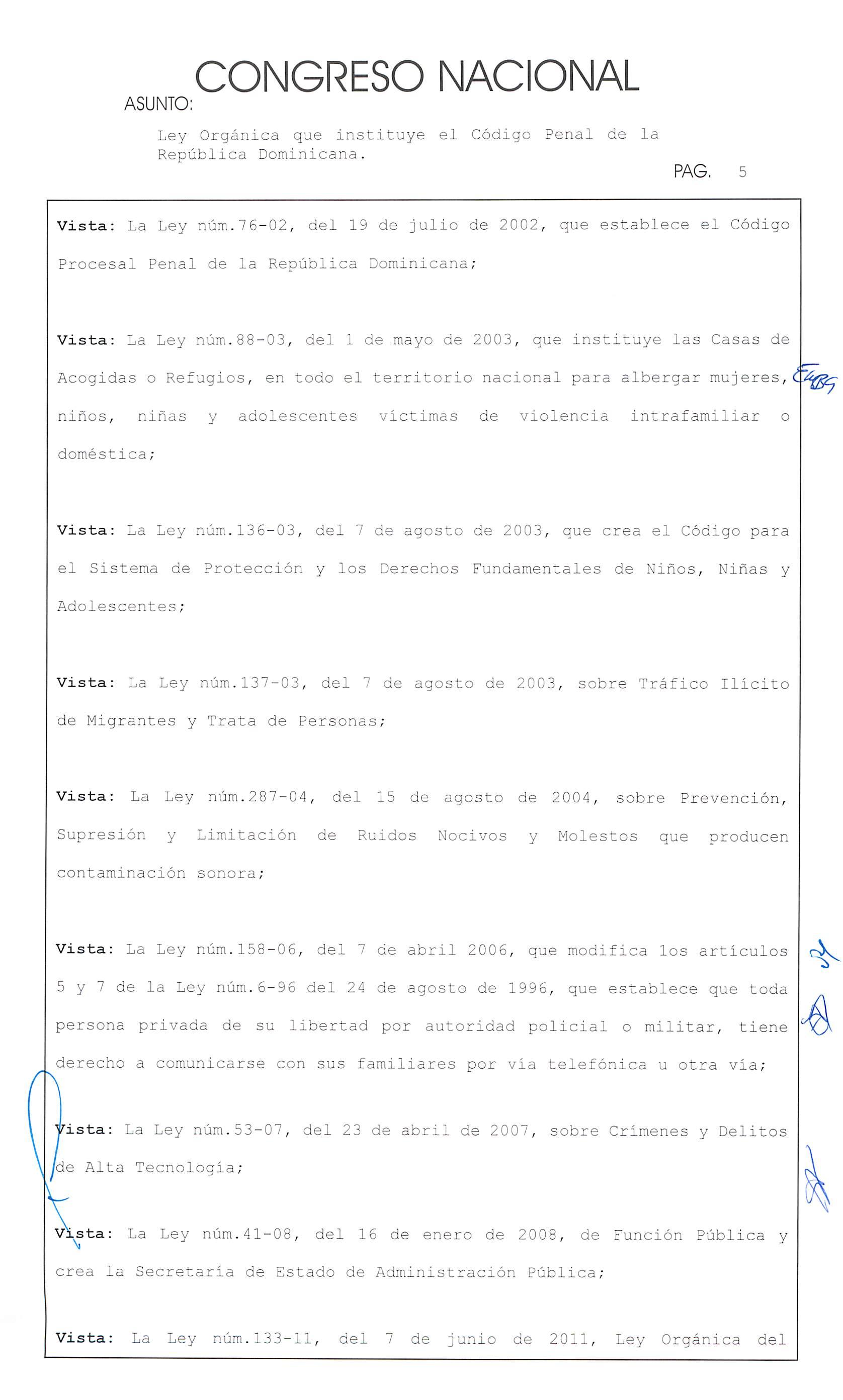 Considerando quinto: Que la sociedad dominicana requiere de la aprobación de un código penal que responda a los principios 'fundamentales establecidos en la Constitución de la República;
