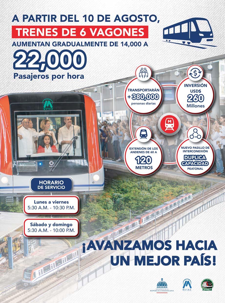 Tras sus palabras, Abinader recorrió varias estaciones en los nuevos vagones del Metro junto a funcionarios y la prensa. Antes de esta ampliación, el director de la Opret dijo que el sistema contaba con 43 trenes y cada formación de tres vagones requería 60 metros de longitud. Ahora, al acoplar seis vagones, se alcanza una extensión de 120 metros, lo que fue posible tras adecuaciones de infraestructura.