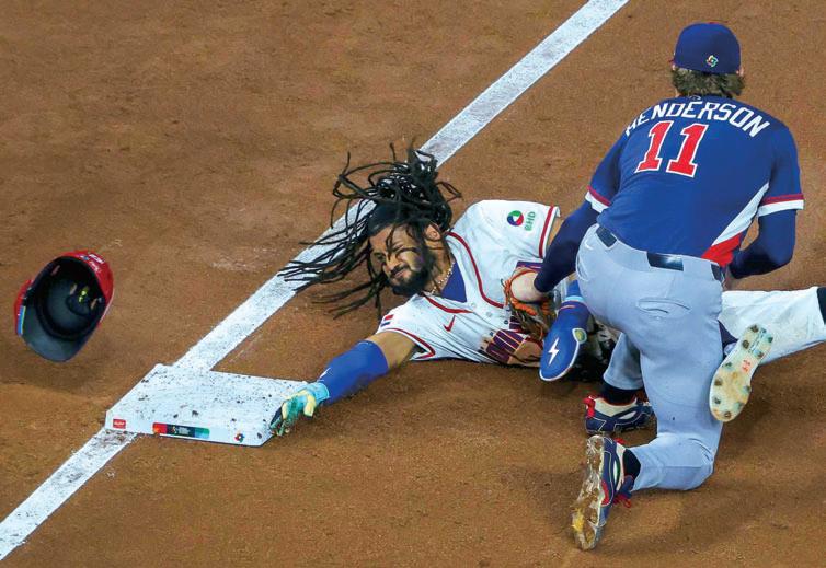 MIAMI. La República Dominicana quedó eliminada en la semifinal del Clásico Mundial de Béisbol al caer ante los Estados Unidos por 2-1 anoche en el LoanDepot Park. El pitcheo del conjunto de las barras y las estrellas pudo frenar a la ofensiva más caliente del torneo de veinte naciones y mañana buscará su segunda corona con el ganador del choque de este lunes entre Italia y Venezuela. En la imagen, Fernando Tatis Jr. es puesto out en un intento de llegar a la antesala. b P13