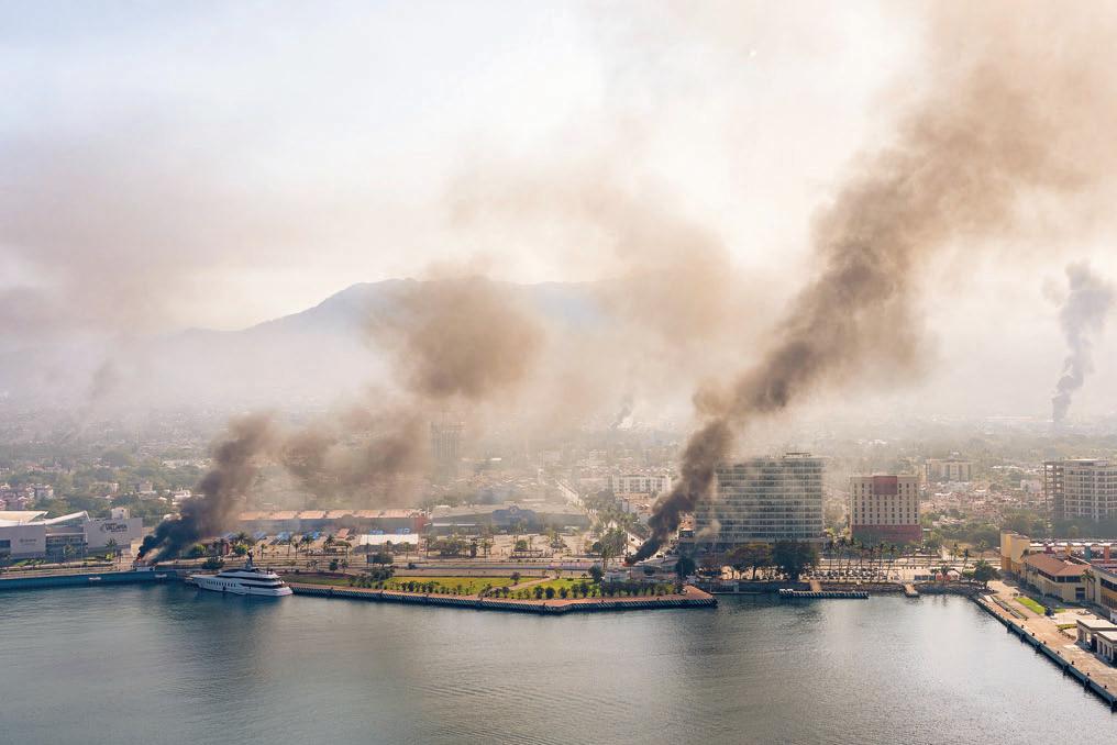 pJALISCO. Columnas de humo se elevan en Puerto Vallarta, México, por los incendios que ocasionaron seguidores de Nemesio Rubén Oseguera Cervantes, alias “El Mencho”, líder del Cártel Jalisco Nueva Generación (CJNG), quien fue abatido ayer por miembros del Ejército. La muerte del narcotraficante desató una ola de violencia y bloqueos carreteros en 21 estados del país. El Ejército señaló que la acción fue el resultado de trabajos de inteligencia y de información complementaria proporcionada por Estados Unidos. b P18