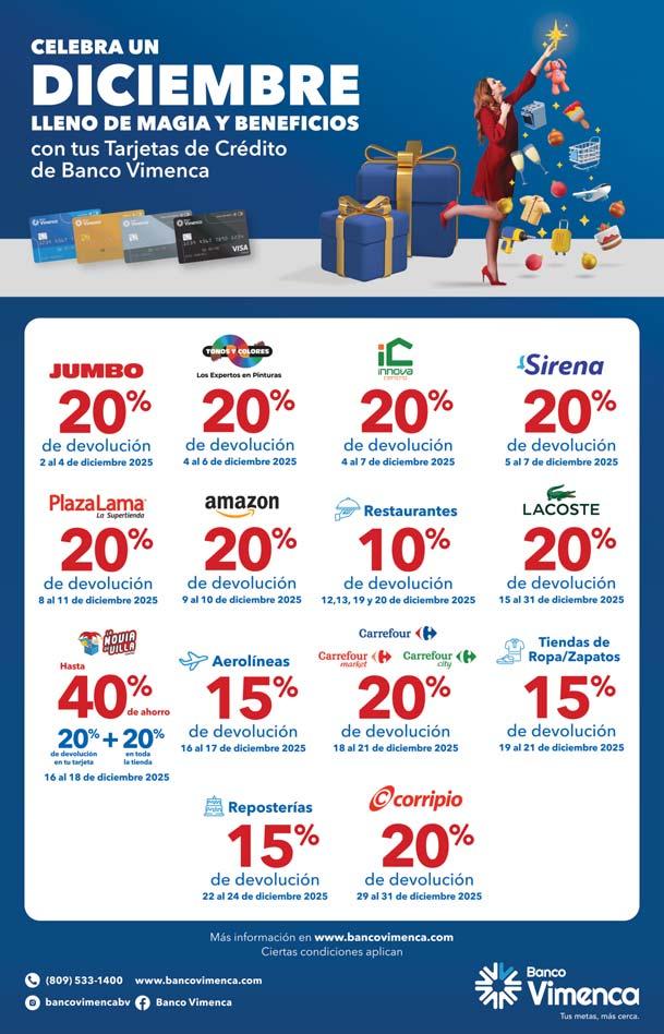 SD. El presidente Luis Abinader, la primera dama Raquel Arbaje, la alcaldesa del Distrito Nacional, Carolina Mejía, y el presidente ejecutivo del Banco de Reservas, Leonardo Aguilera, inauguraron ayer la cuarta edición de Villa Navidad 2025, en los jardines del Centro Olímpico Juan Pablo Duarte. Abinader invitó a las familias a disfrutar de las fiestas y de ese espacio, que estará abierto hasta el lunes 5 de enero de 2026 de seis de la tarde a diez de la noche. b P4