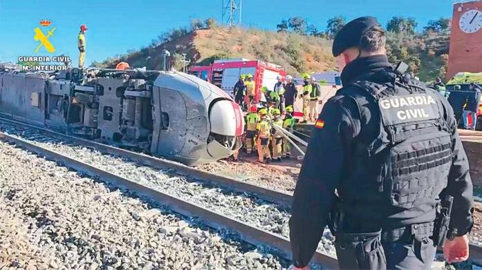 pMADRID. Vista de uno de los dos trenes que chocaron en España dejando al menos 40 muertos y 41 heridos ingresados, de los que 12 están en intensivo (UCI). También hay desaparecidos. El accidente ocurrió la tarde del domingo en Córdoba, al sur, cuando un tren que circulaba entre Málaga y Madrid se descarriló e impactó contra otro que viajaba entre Madrid y Huelva. El Gobierno y el presidente Abinader expresaron sus condolencias a España. b P9