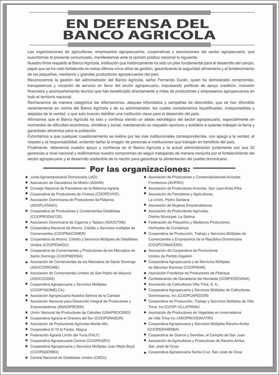 Banco Agrícola para préstamos a tasa cero. De acuerdo con el documento, una parte significativa de esos fondos no habría beneficiado a pequeños y medianos productores, sino a grandes empresarios con mayor capacidad de acceso al crédito, incluyendo personas sin actividad agropecuaria directa. Otro aspecto señalado es la reducción de los servicios de asistencia técnica. b
