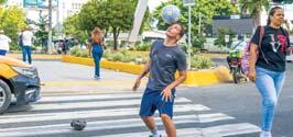 Este joven aprovecha su talento en el manejo del balón y entretiene, a cambio de propinas, a los cientos de conductores que esperan que el semáforo cambie de rojo a verde en la concurrida intersección de las avenidas Máximo Gómez y 27 de Febrero, en el Distrito Nacional.