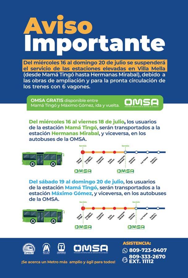 SANTO DOMINGO. La Oficina para el Reordenamiento del Transporte (Opret) recordó que desde hoy y hasta el próximo domingo será suspendido el servicio de la línea 1 del Metro de Santo Domingo en las cinco estaciones de Villa Mella. Durante ese tiempo se harán trabajos de ajuste de señalética y otros aspectos ante la entrada de trenes de seis vagones al sistema a partir de agosto próximo para ofrecer un servicio más ágil, cómodo y seguro