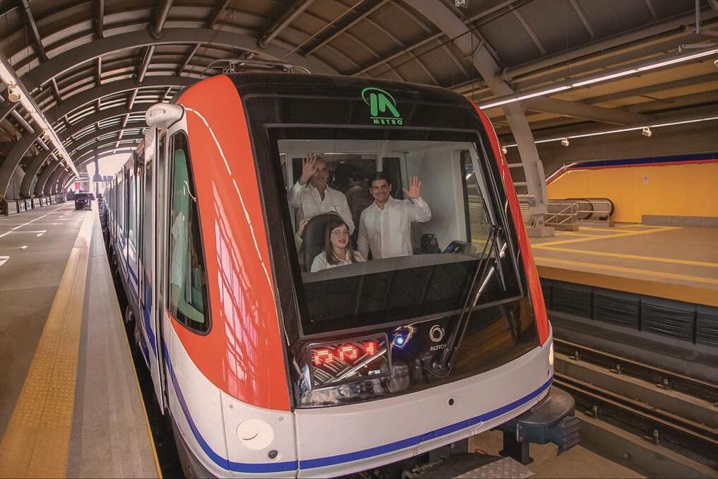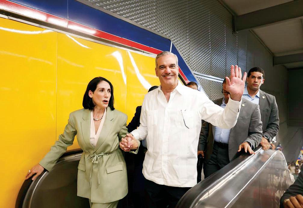 p SD. El presidente Luis Abinader y el director de la Empresa Metropolitana de Transporte (EMT), Jhael Isa Tavárez, saludan durante el recorrido inaugural ayer de la Línea 2C del Metro de Santo Domingo. A bordo de la cabina también se encontraba la primera dama, Raquel Arbaje. La obra, que conllevó una inversión de 506 millones de dólares, tendrá la capacidad de transportar 15,000 pasajeros por hora por sentido para un total de 150 mil pasajeros al día. b P6