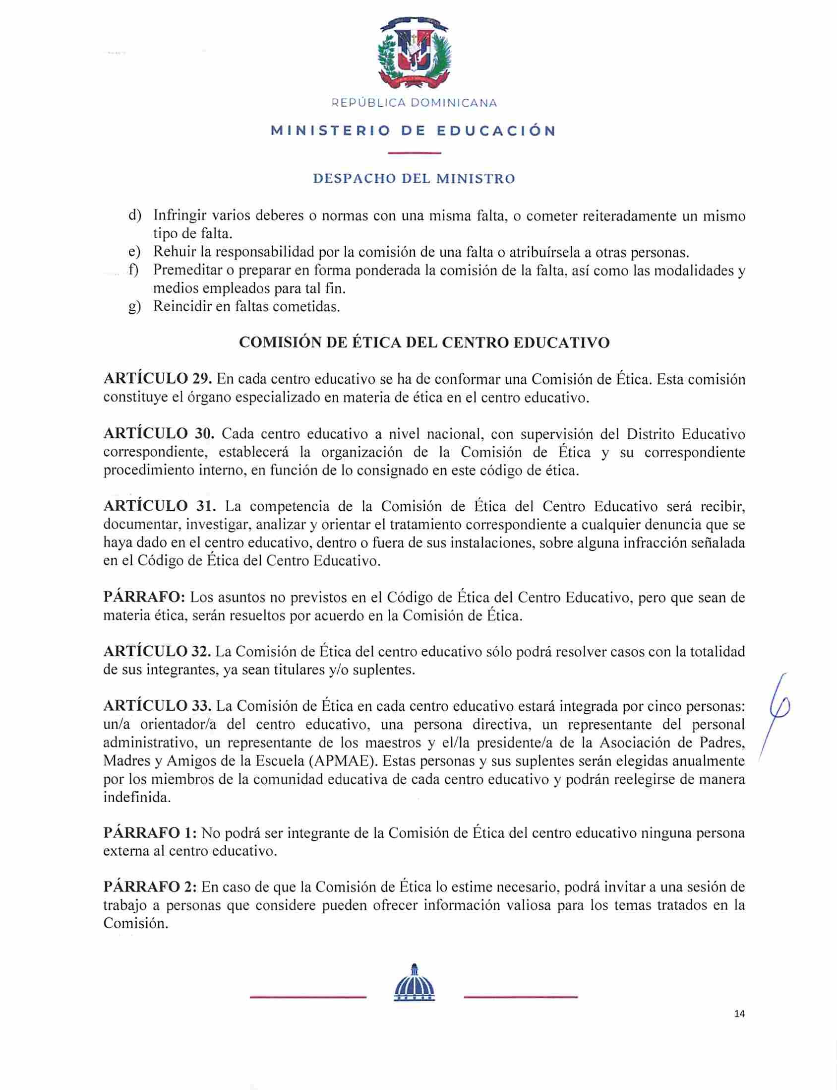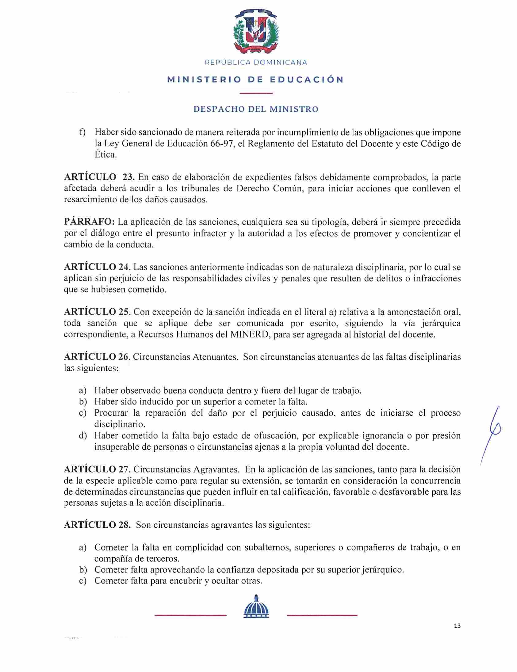 Reiterar del incumplimiento de alguna de las obligaciones impuestas por la Ley General de Educación 66-97, el Reglamento del Estatuto del Docente, la Ley de Función Pública y/o el presente Código de Ética.