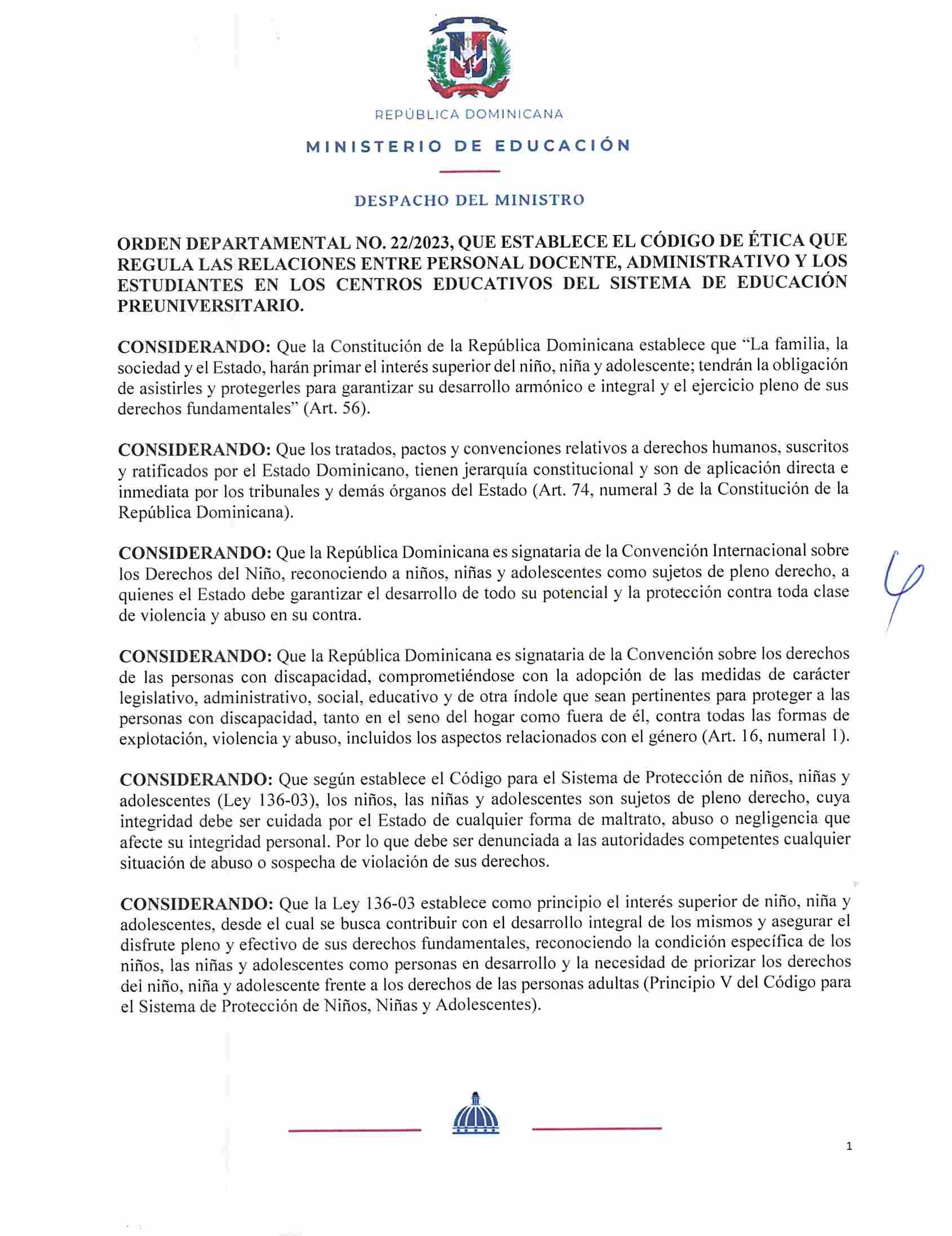 ORDEN DEPARTAMENTAL NO.22/2023,QUE ESTABLECE EL CÓDIGO DE ÉTICA QUE REGULALAS RELACIONES ENTRE PERSONAL DOCENTE,ADMINISTRATIVO Y LOS ESTUDIANTES EN LOS CENTROS EDUCATIVOS DEL SISTEMA DE EDUCACIÓN PREUNIVERSITARIO.