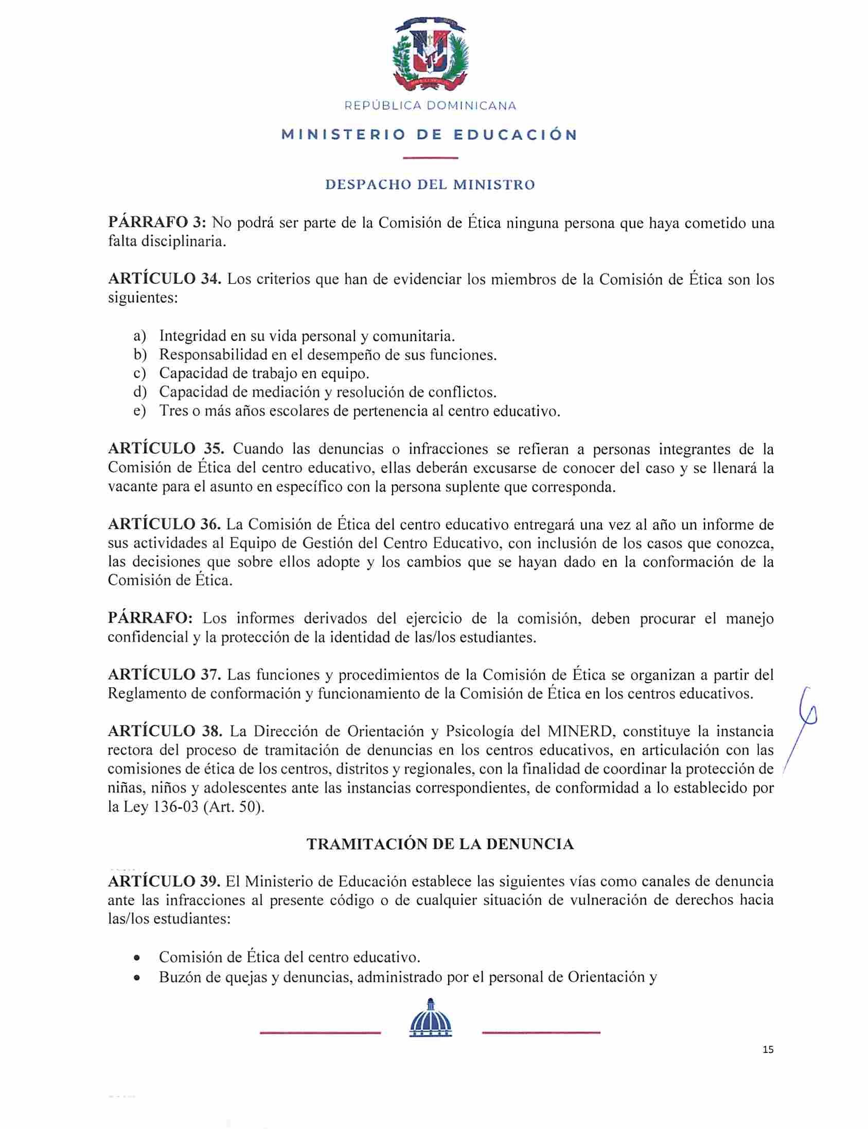 PÁRRAFO: En caso de agotar el plazo correspondiente, las denuncias deberán ser remitidas a la Comisión de Ética del Distrito Educativo.
