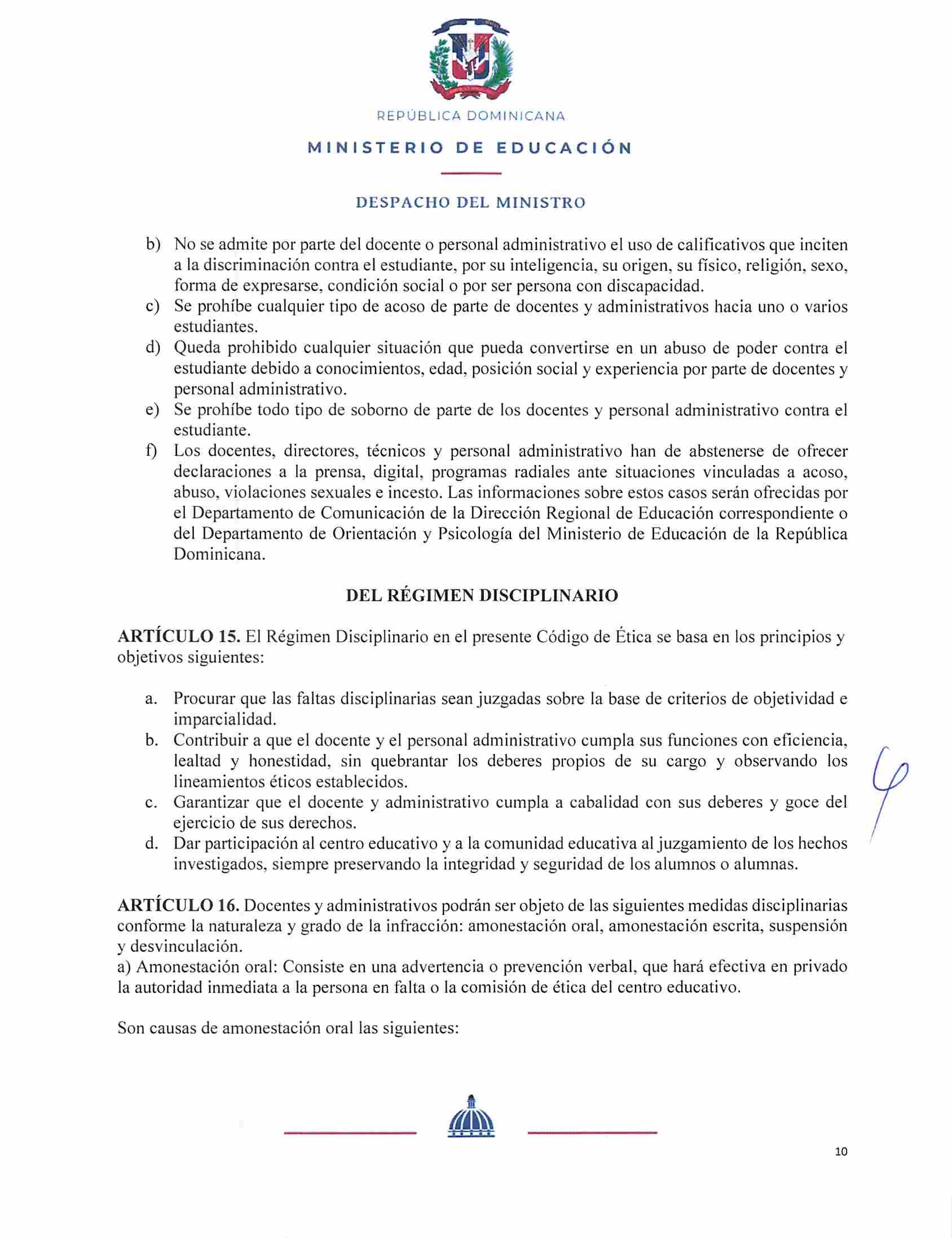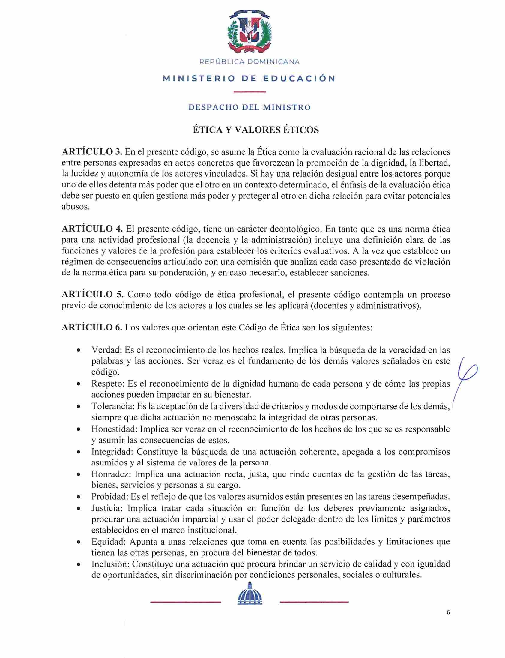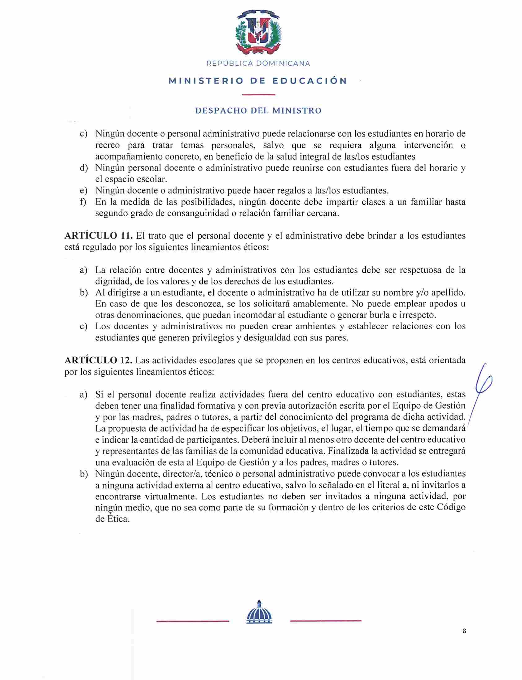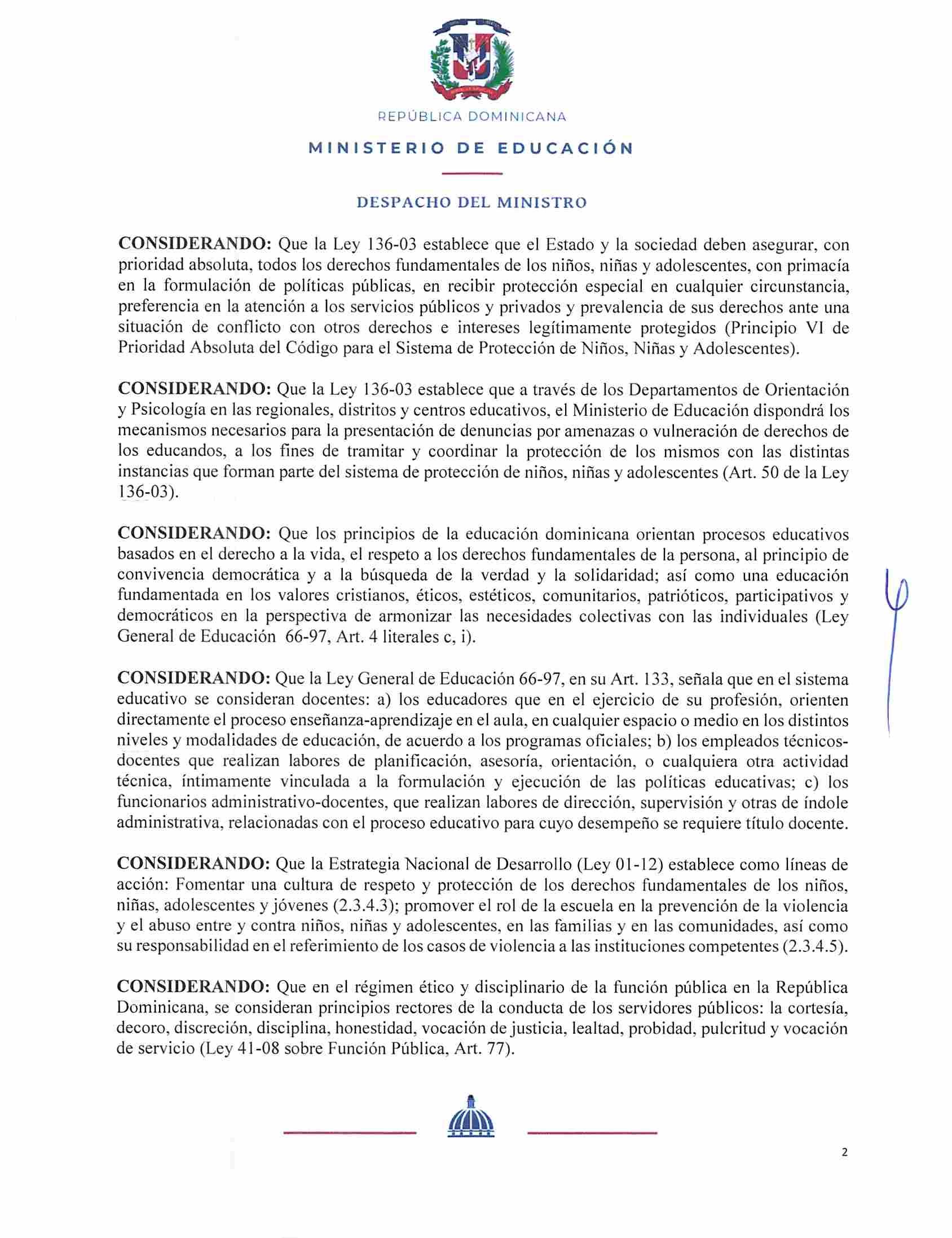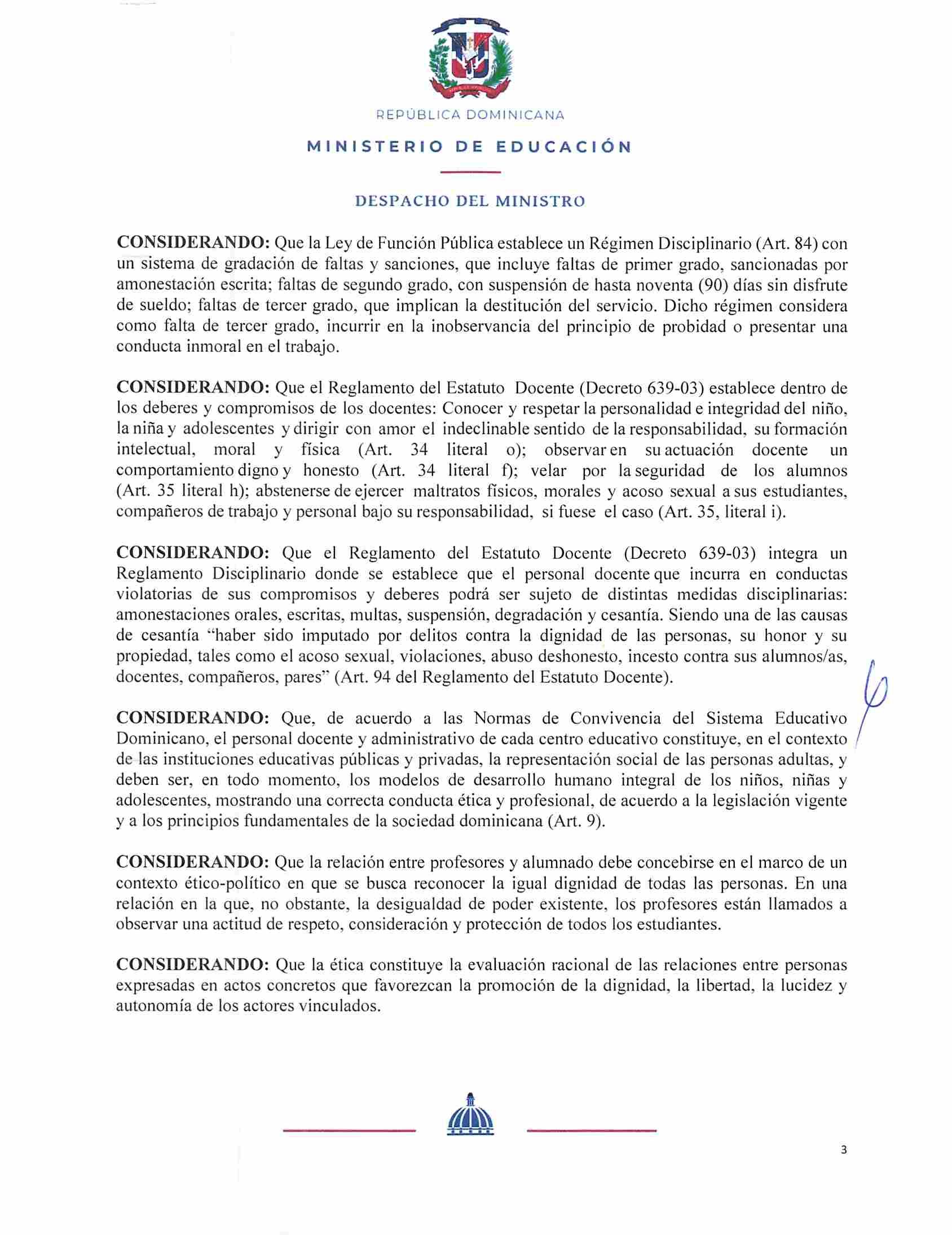CONSIDERANDO: Que, de acuerdo a las Normas de Convivencia del Sistema Educativo Dominicano, el personal docente y administrativo de cada centro educativo constituye, en el contexto de las instituciones educativas públicas y privadas, la representación social de las personas adultas, y deben ser, en todo momento, los modelos de desarrollo humano integral de los niños, niñas y adolescentes, mostrando una correcta conducta ética y profesional, de acuerdo a la legislación vigente y a los principios fundamentales de la sociedad dominicana (Art. 9).