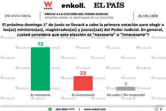 Ciudad de México.- La Presidenta de México, Claudia Sheinbaum Pardo, presentó la encuesta que publicó el diario El País, realizada por Enkoll, donde el 72 por ciento de las mexicanas y los mexicanos considera que es necesaria la elección para reformar al Poder Judicial de la Federación.