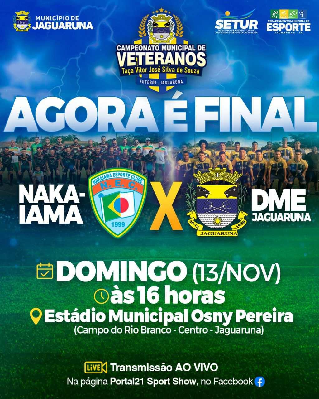 Nakaima e DME Jaguaruna se enfrentam neste domingo, dia 13/11, às 16h, pra definir quem será o GRANDE CAMPEÃO da Taça Vitor José Silva de Souza, Campeonato Municipal de Futebol.