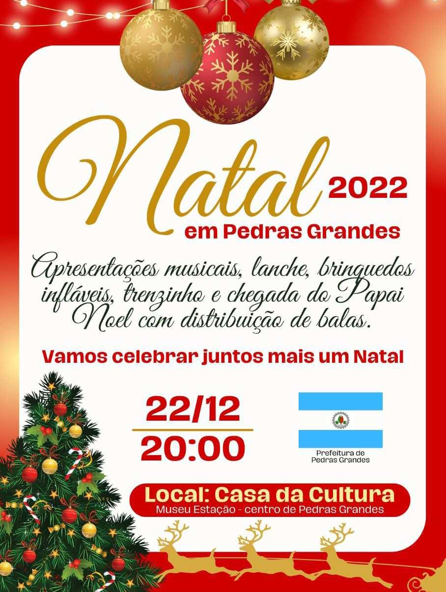 APrefeitura de Pedras Grandes vai realizar no dia 22 de dezembro em evento de Natal, a partir das 20 horas, na Casa da Cultura. As secretarias da Prefeitura já estão trabalhando na organização das atividades natalinas voltadas especialmente para as crianças. O evento terá apresentações musicais, lanche, brinquedos infláveis, trenzinho e chegada do Papai Noel com distribuição de balas. Vamos celebrar juntos mais um Natal!