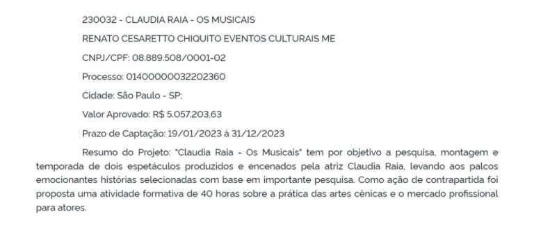 Por meio da Lei Rouanet, o governo federal aprovou a captação de R$ 5 milhões para o projeto “Claudia Raia — Os Musicais”. A peça é estrelada pela atriz global. A edição desta quinta-feira, 19, do Diário Oficial da União, trouxe a publicação da portaria com a homologação da proposta.