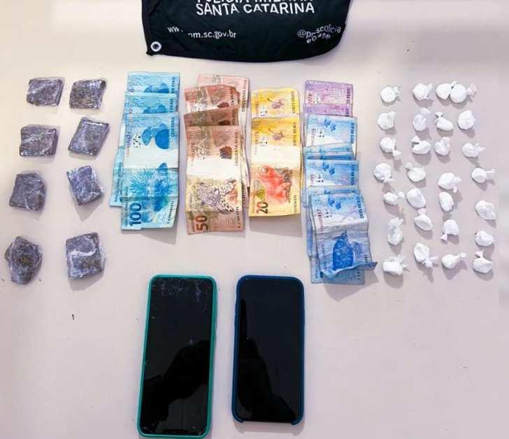 Ao fazer a abordagem, foi apreendido um total de R$ 614, 29,8 gramas de cocaína e 57 gramas de ma-