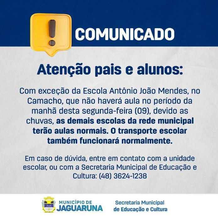 lação as aulas no período vespertino na Escola Antônio João Mendes (Camacho), estaremos monitorando de perto a situação durante a manhã e, posteriormente, comunicaremos se haverá ou não aulas no período da tarde.