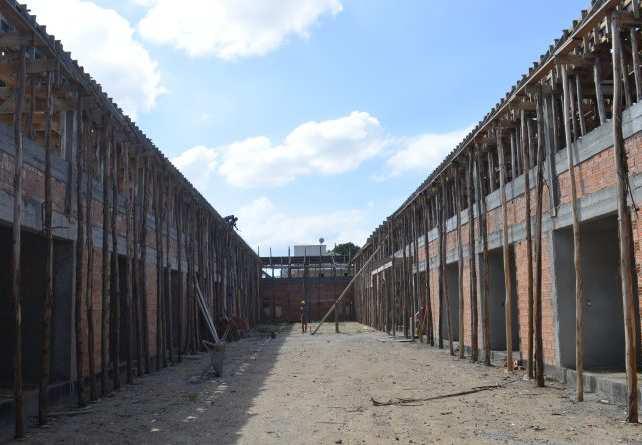 Nesta segunda-feira (11), os operários do canteiro de obras trabalhavam em diversos acabamentos da parte da alvenaria do térreo e, também, nas caixarias das estruturas que serão concretadas para receber a cobertura.