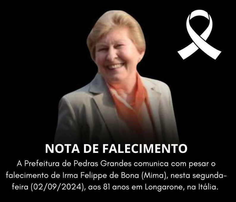 APrefeitura de Pedras Grandes comunica com pesar o falecimento de Irma Felippe de Bona, na manhã desta segunda-feira, em Longarone, na Itália.