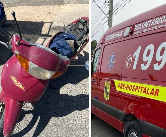 100, no Balneário Camacho, em Jaguaruna. Os Bombeiros Voluntários foram acionados para atender a ocorrência e encontraram o motociclista na calçada da via com dores no corpo e escoriações no rosto, perna e joelho.