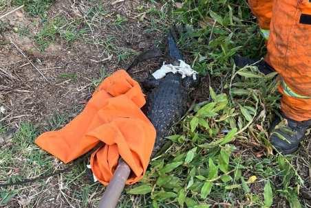 Os Bombeiros Voluntários de Jaguaruna realizaram o resgate de um jacaré na manhã desta terça-feira (14), na rua Otávio Manoel Batista, na localidade de Garopaba do Sul, em Jaguaruna.