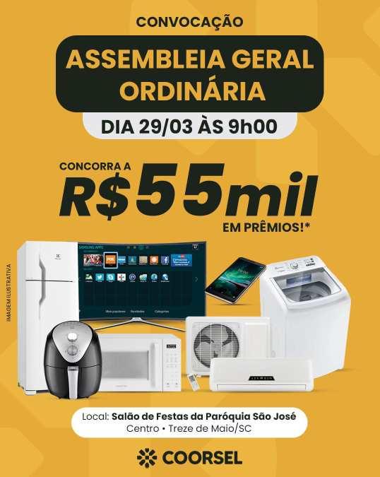 Atenção, associados da Coorsel! No dia 29 de março , às 9h , acontece a Assembleia Geral Ordinária no Salão de Festas da Paróquia São José , no Centro de Treze de Maio. Participe e fique por dentro das decisões da cooperativa! Grandes prêmios serão sorteados a todo os associados presentes que estiverem em dia com a conta de energia elétrica. Como TV, ar-condicionado, lavadora, geladeira e muito mais. Dia 29 de março, às 9h! Esperamos por você! Coorsel – Tudo fica melhor com energia!