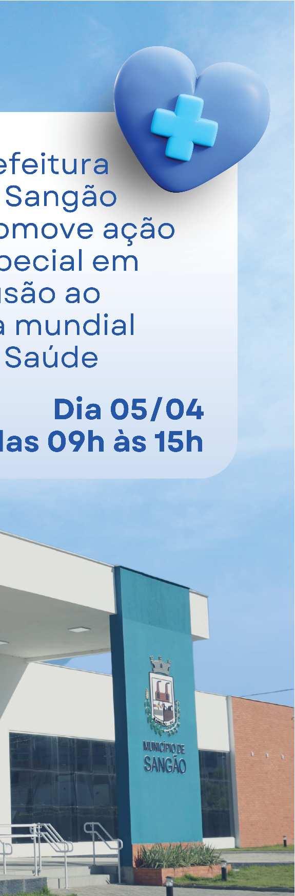 Neste sábado, dia 5 de abril, a Prefeitura de Sangão promoverá uma ação especial em homenagem ao Dia Mundial da Saúde. O evento acontecerá na Rua 30 de Março, no Centro ViverBem,eestaráabertoàpopulação das 9h às 15h, oferecendo uma variedade de serviços gratuitos.