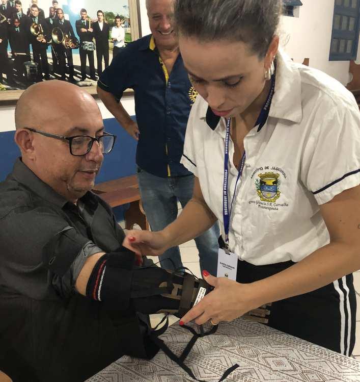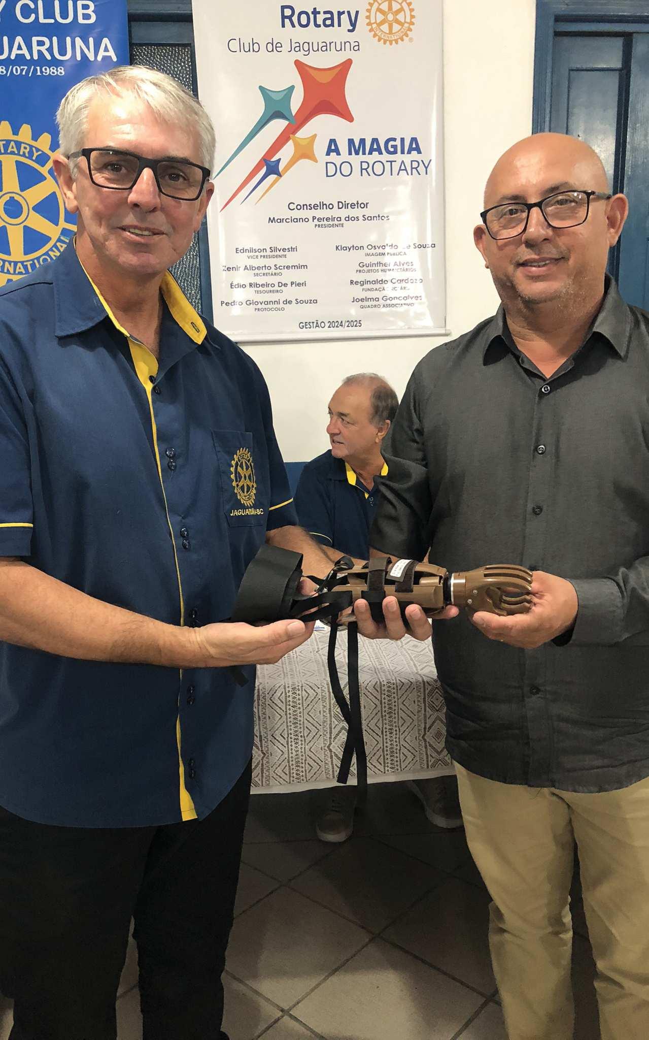 anoitedeterça-feira,(02/04), o Rotary Club de Jaguaruna promoveuumareuniãoextraordinária marcada pela empatia, solidariedade e com um propósito principal: a entrega simbólica de uma prótese de mão ao senhor JoséArnaldo Lima Marques, momento este também acompanhado por seus familiares. A prótese foi viabilizada pelo Rotary Club, por meio de uma iniciativa voltada à promoção da dignidade e inclusão. Durante a reunião, a fisioterapeuta da saúde Glaucia Carvalho foi a responsável por realizar a colocação da prótese, além de prestar todas as orientações sobre o uso e o processo de adaptação. O presidente do clube, Marciano Pereira dos Santos, conduziu a entrega simbólica junto com os demais companheiros de clube presentes na ocasião.