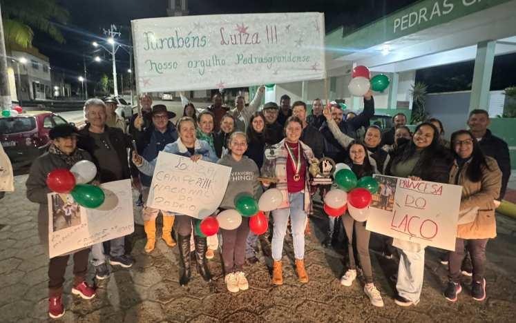 zaConstantesagrou-sevice-campeã nacional de laço no rodeio de Cristalina, em Goiás, no último final de semana. De volta a sua cidade natal, a jovem foi recebidaporamigosefamiliarescomumafesta no centro de Pedras Grandes, quando foi homenageada pelo feito inédito. Praticante da modalidade há cerca de três anos e já tendo conquistado o título de campeã estadual, Luiza agora pretende participar do rodeio de Vacaria e um dos seus maiores sonhos é ganhar o rodeio milionário. O prefeito de Pedras Grandes, Agnaldo Filippi, parabenizou a atleta e concedeu a ela uma medalha de mérito pela conquista e por representar um município no esporte nacional.