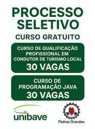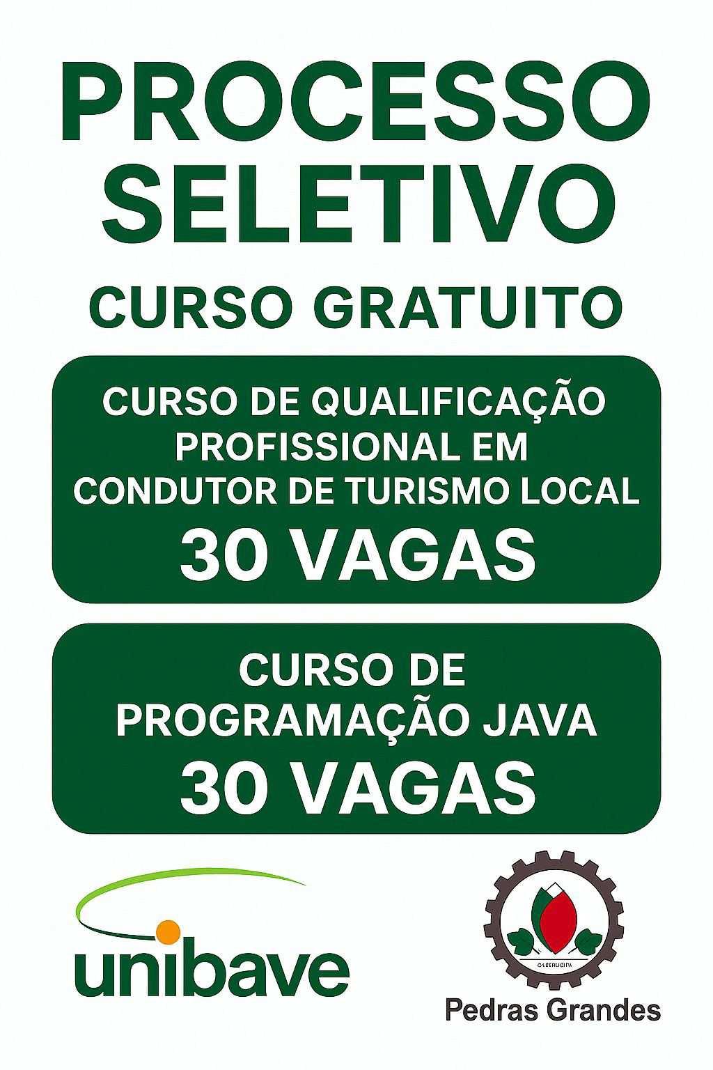 APrefeituradePedrasGrandeseaUnibavecomunicam a abertura de processo seletivo para o preenchimento de vagas nos cursos gratuitos que serão realizados pela Universidade em Pedras Grandes. São oferecidas 30 vagas gratuitas para curso de qualificação profissional em condutor de turismo local e 30 vagas gratuitas para curso de programação Java. A inscrição para o curso de condutor de turismo poderá ser feita pelo link: https://unibave.engaged.com.br/funil/condutor-de-turismo-local-pedras-grandes/turma-1-condutores-de-turismo-local-pedras-grandes Para o curso de programação, a inscrição deverá ser feita pelo link: https://unibave.engaged.com.br/funil/programacao-logica-java-pedras-grandes/turma-1-programacao-logica-java-pedras-grandes.