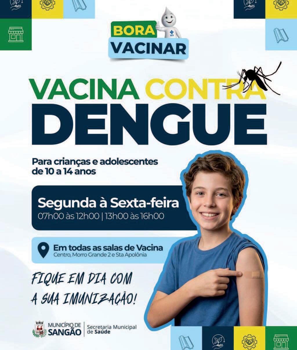 Omunicípio de Sangão inicia nesta quarta-feira, dia 28, a vacinação contra a dengue. A ação segue a orientação do Ministério da Saúde e da Secretaria de Estado da Saúde de Santa Catarina, priorizando, neste primeiro momento, exclusivamente o público de 10 a 14 anos.