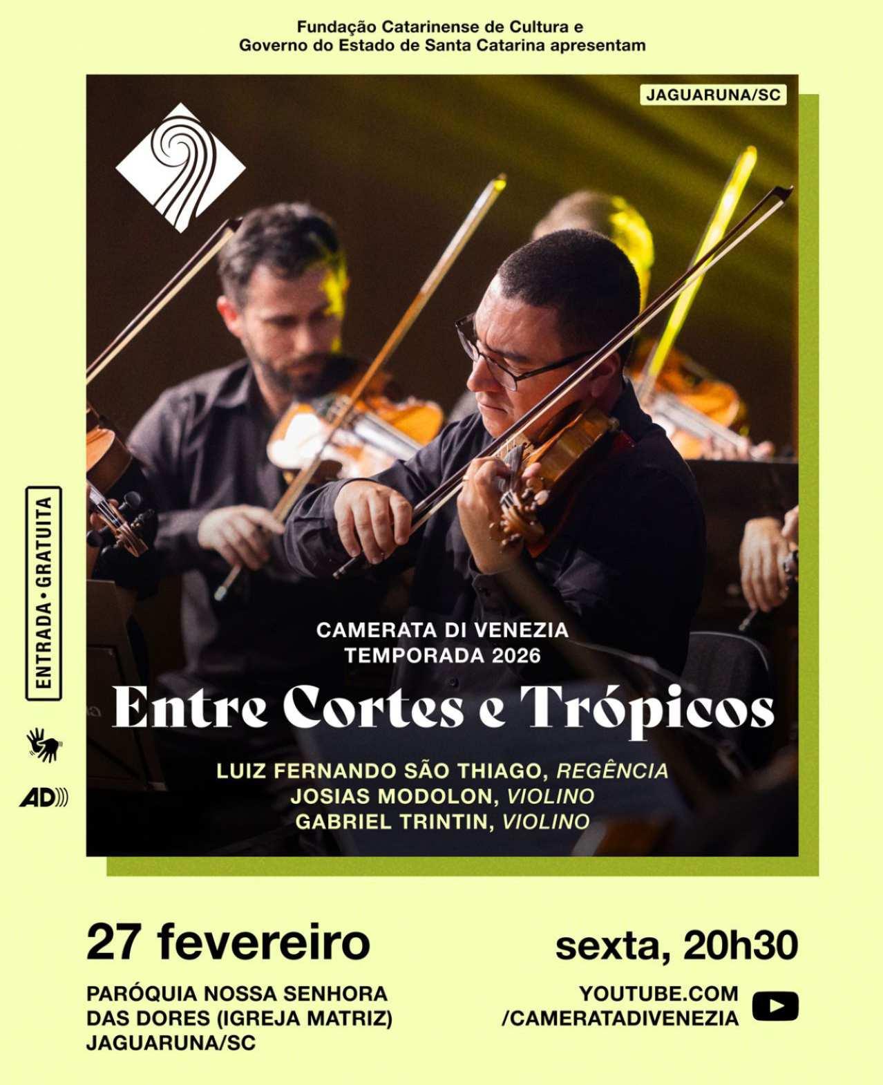 Aorquestra Camerata di Venezia realiza, no dia 27 de fevereiro (sexta-feira), às 20h30, o concerto “Entre Cortes e Trópicos”, na Paróquia Nossa Senhora das Dores, em Jaguaruna. A apresentação marca a abertura da Temporada 2026 na região e terá entrada gratuita, além de transmissão ao vivo pelo canal oficial da orquestra no YouTube.